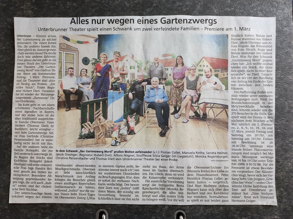 Seit dem 01. März läuft an den Wochenenden die Inszenierung des Gartenzwerg Mordes aufgeführt von der Theaterkompanie Unterbrunn!